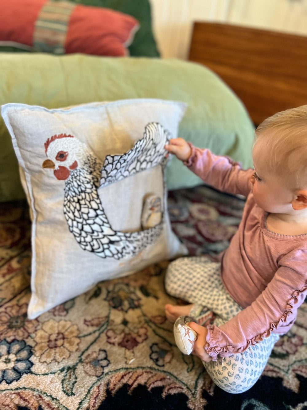 "I bought this for the nursery, but this pillow is so unique that I put it in our living room. My one-year-old loves to play with the mother hen and her two chicks."