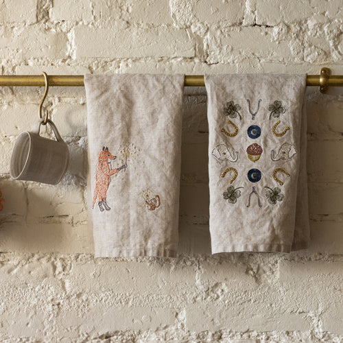 We rarely use dark grounds for our embroideries; creating the Halloween House was a perfect opportunity to let silver and gold metallic threads really SHINE. On the house, skeletons, stars, bats, and moon phases frame the entryway and windows. Inside find a mummy fox emerging from a coffin tilted against the back wall, an Ouija board on the floor, and bats flying down from the rafters. I have NEVER toyed with an Ouija board, so this was fun to incorporate into the design. On the back of the house, ghost bunnies peer over the shoulder of Kitty Witch as she summons the future in her crystal ball set on an hourglass.