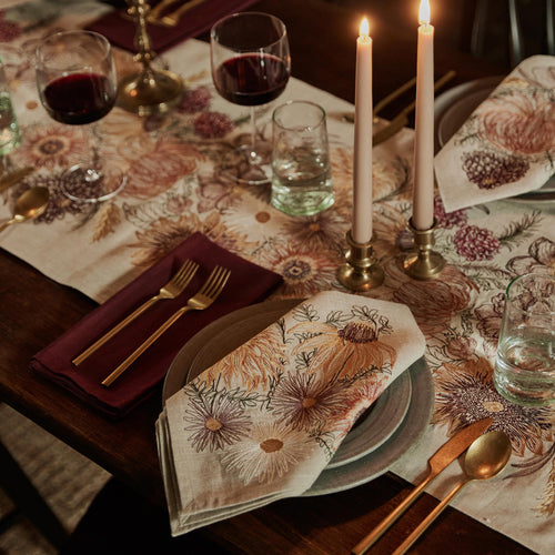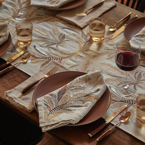 Fowls stick to the ground and with their familial flock. Their naturally patterned plumage symbolize unity and togetherness. Each feather design serves as a reminder to cherish and respect the avian creatures of land, flight, sky and air. Dress your table with our found feather tea towels, napkins and table runner.