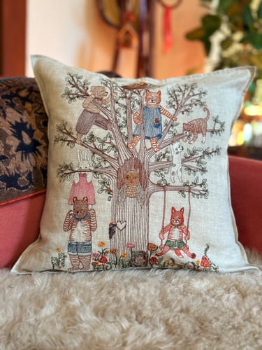 "This pillow is delightful and the embroidery makes me smile. Every detail is lovely. I absolutely love all the little critters. Great quality and design that would fit in any decor!"