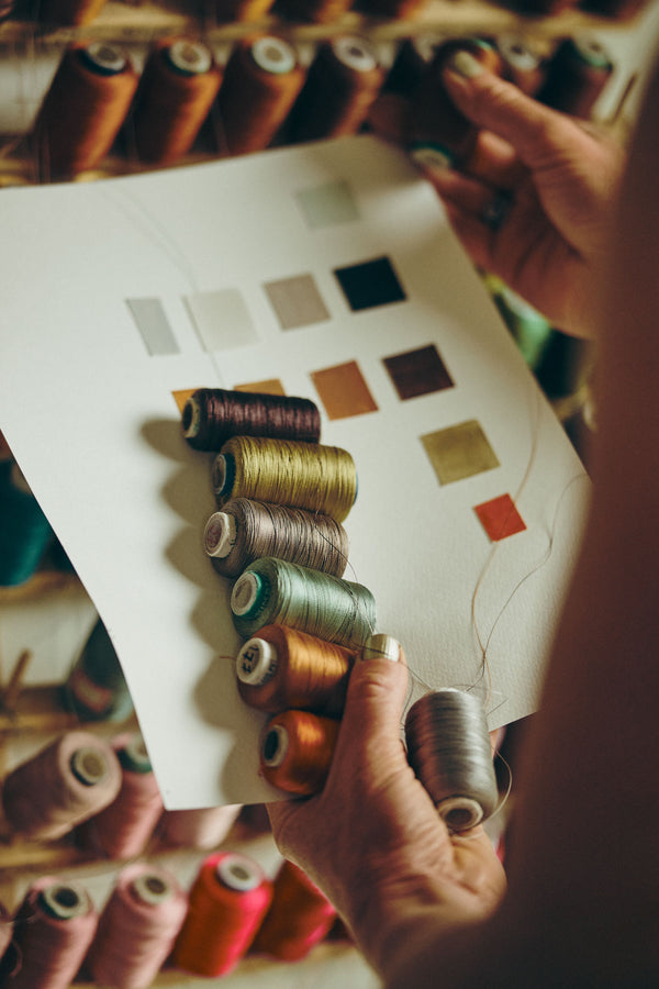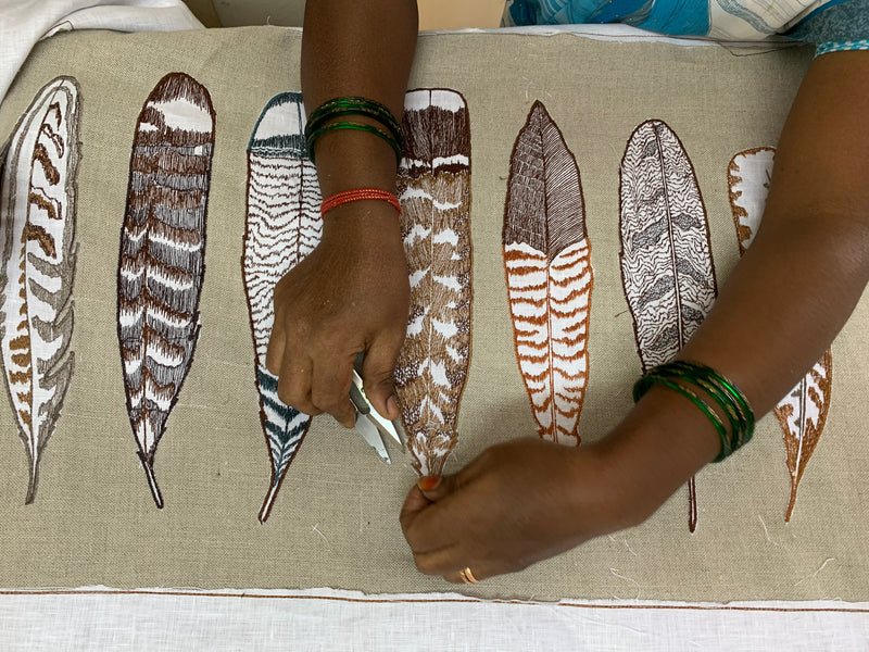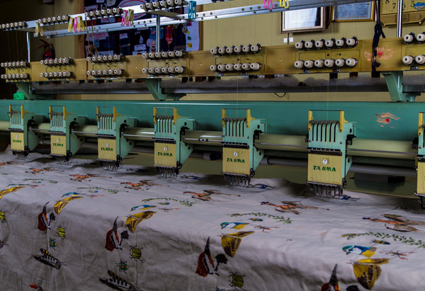 Once the design is perfected, it is then machine embroidered in India by our embroidery partners of over ten years. The large-scale embroidery machines make it possible for us to scale Stephanie's creative process with the flexibility of small production runs.