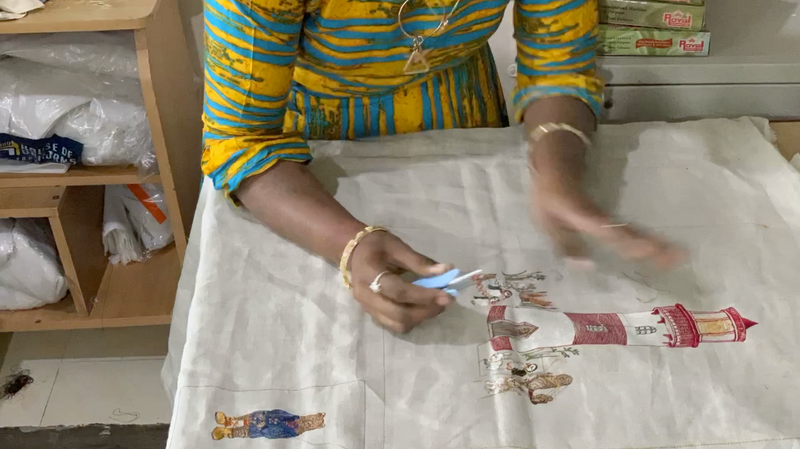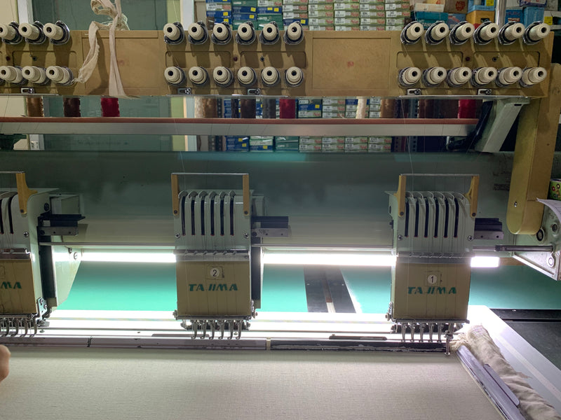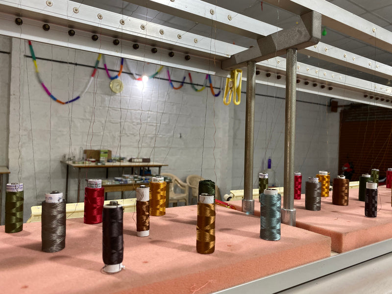 During the embroidery process, each color is embroidered one at a time and a skilled operator manually changes the threads as the colors change. Once the embroidery is completed, there are threads floating across the surface of the design from where the colors change. Each of the threads are expertly trimmed by a team of women.