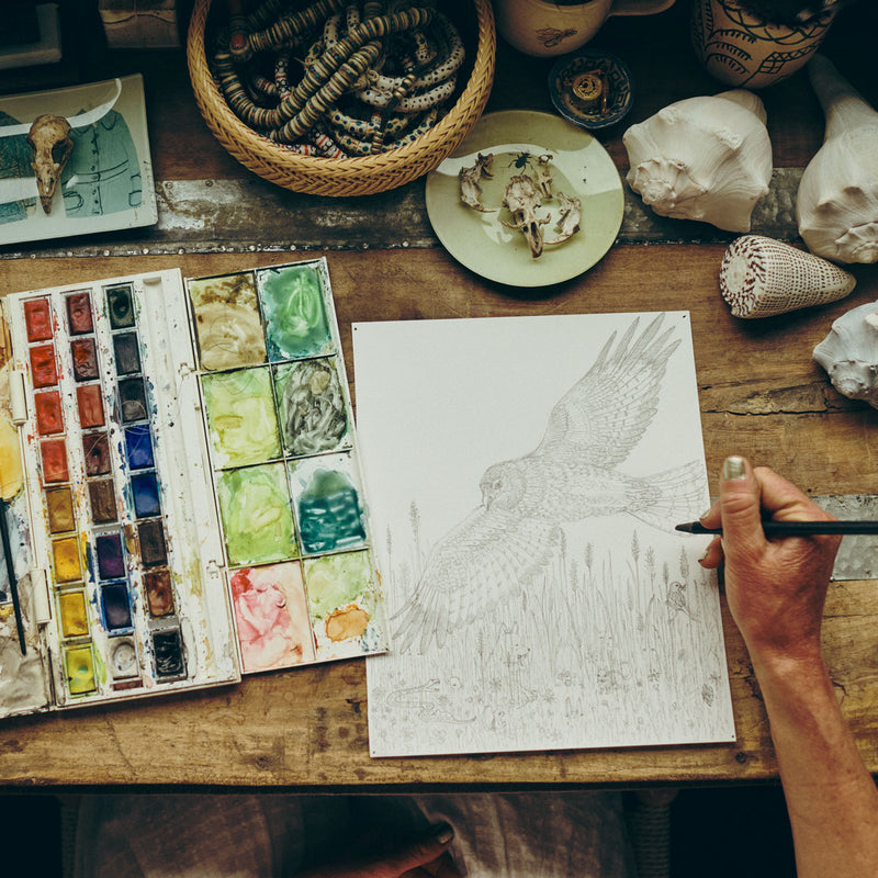 Stephanie first creates her irreverent characters and bold pattern designs by putting pencil to paper. Every collection begins with abundant research and each individual design stems from her original hand-drawn illustrations.
