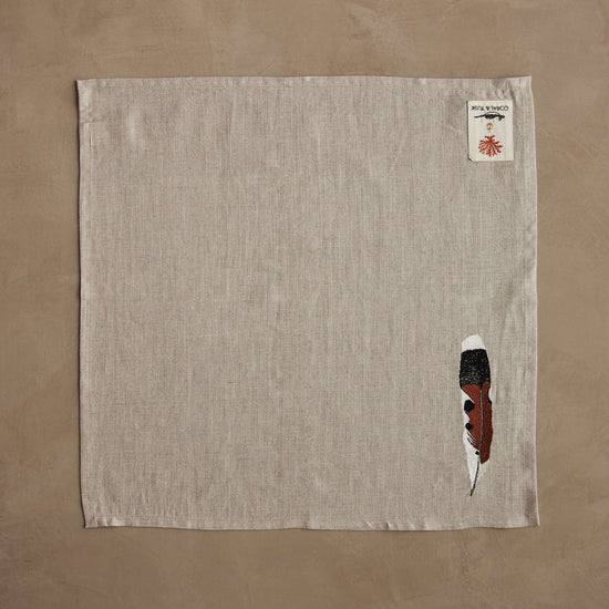 Our dinner napkins begin as blank canvases. Each napkin is hemmed and then individually embroidered on their embroidery machine. Once the embroidery is complete, a skilled seamstress finishes the napkins by trimming the threads. The napkin is then folded and pressed. This entire process can take up to three hours for a single napkin.