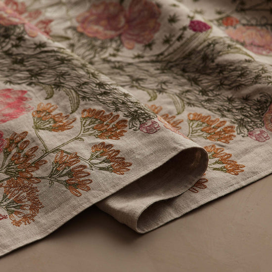 Our table runner designs have nearly a million stitches! It can take up to two days for some of our runners to be embroidered. All of our embroidery is overseen by a skilled operator who manually changes threads each time the color changes. After the embroidery is completed, it takes another hour and a half for each runner to be expertly hand-sewn and finished with care.