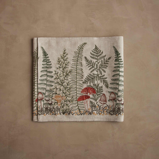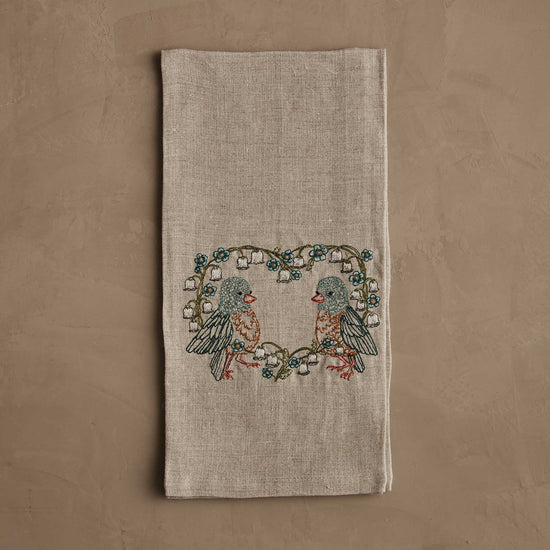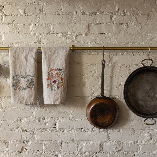 Our tea towels begin as blank canvases. First, each tea towel is hemmed. Then our production partners stitch each one individually on their embroidery machine. Once the design is stitched, a skilled seamstress finishes each tea towel by hand, trimming the embroidery threads. The tea towel is then folded and pressed into the final product we send to your home. The entire production process can take up to two hours for a single tea towel.