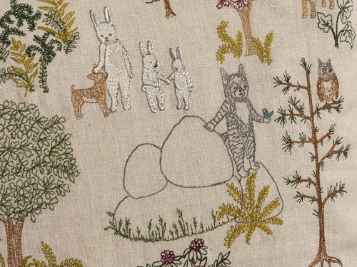 • Embroidered on the front on 100% linen. Back is solid grey linen. Poly-fill stuffing.