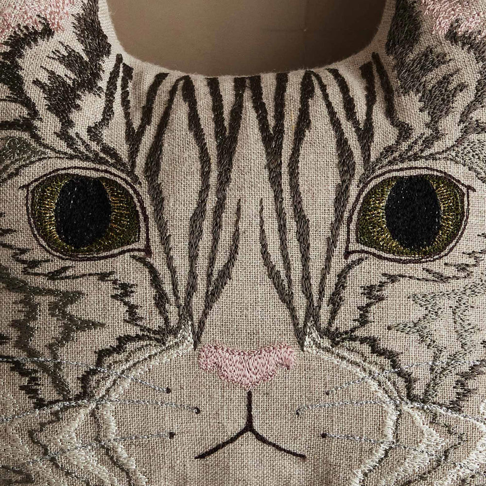 Once the design is perfected, it is machine embroidered in India by our embroidery partner of over ten years. The large scale embroidery machines make it possible for us to scale Stephanie’s creative process with the flexibility of small production runs.